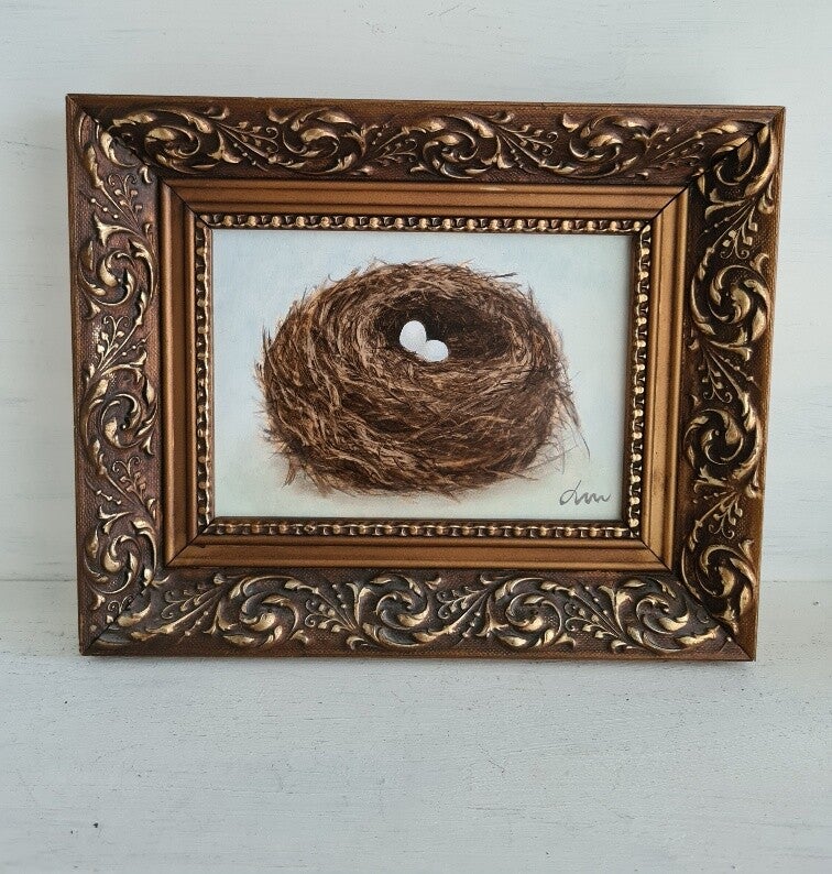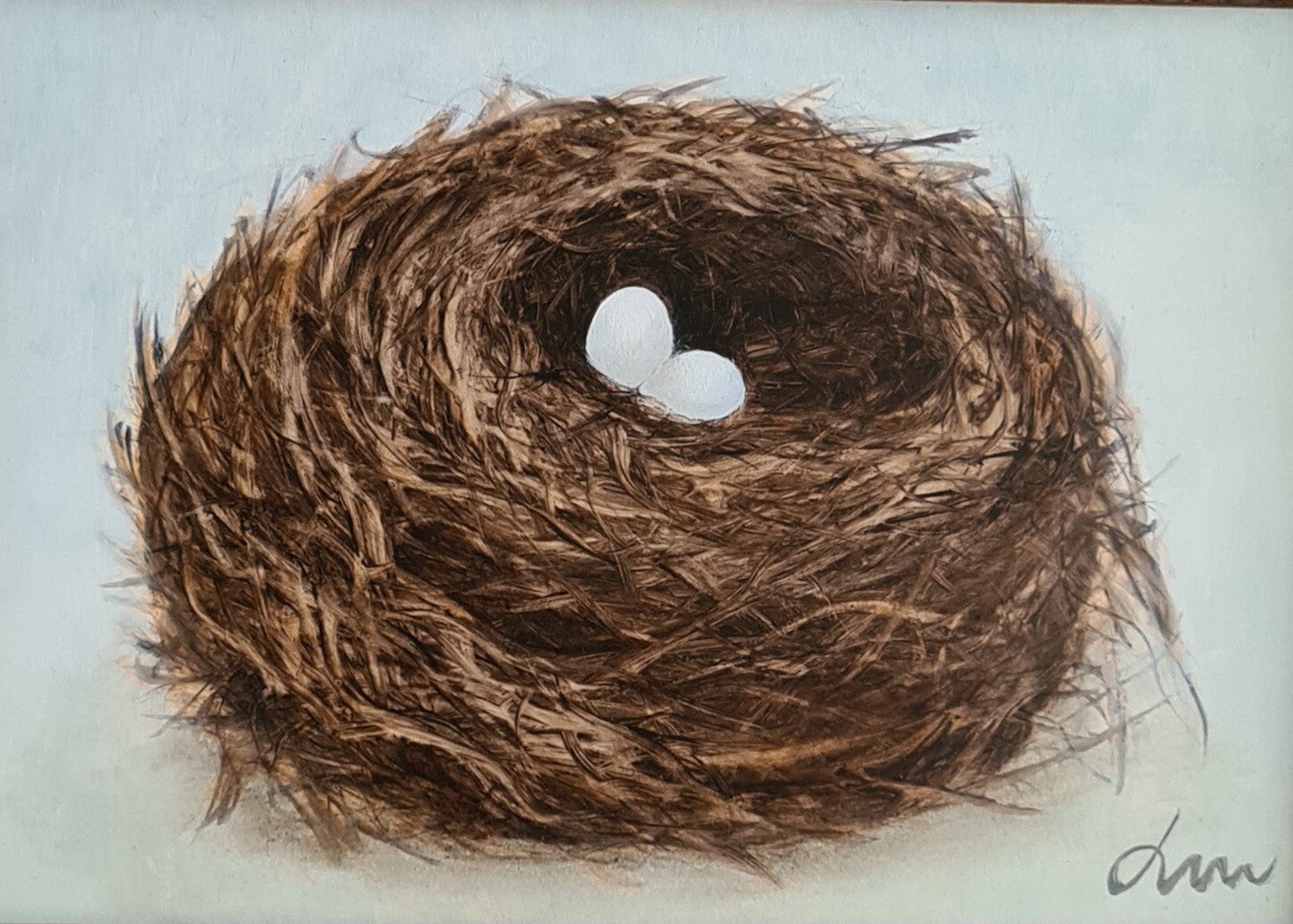 Vogelnestje met eitjes, miniatuur schilderij, geschilderd op masonite.