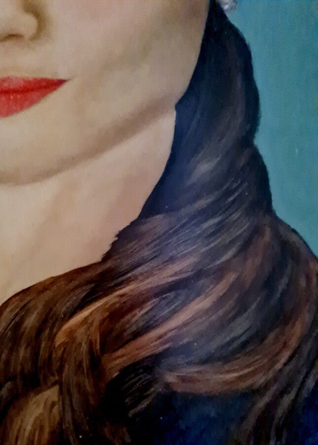 Portret dame, Angela Schijf, miniatuur schilderij, nageschilderd van een foto uit de krant, op masonite.