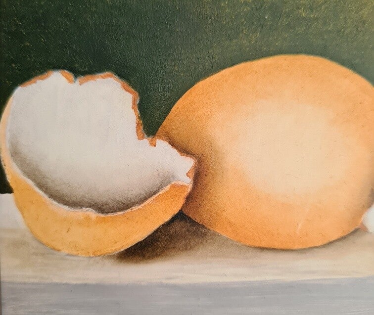 Eieren op tafel, miniatuur schilderij, geschilderd op masonite.