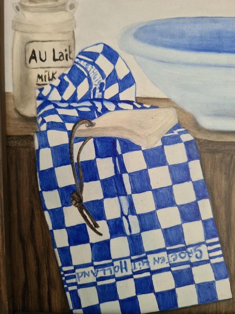 Theedoek met schaal, miniatuur schilderij, geschilderd op masonite.