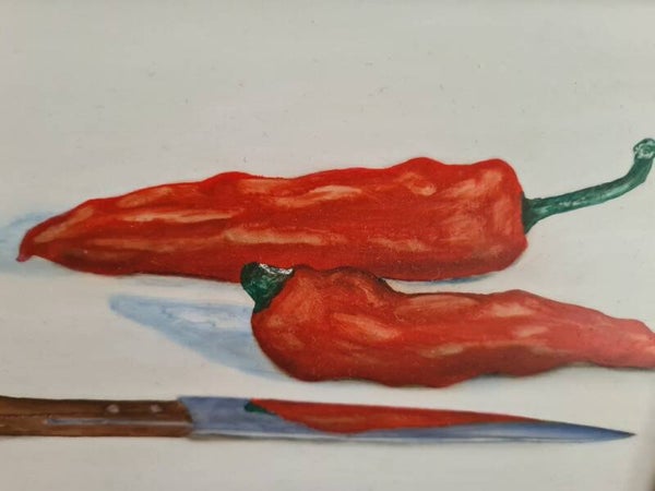 Pepers met mes, miniatuur schilderij, geschilderd op masonite.