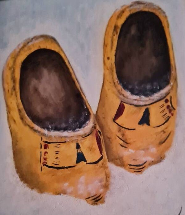 Klompen in de sneeuw, geschilderd op gladde ondergrond.