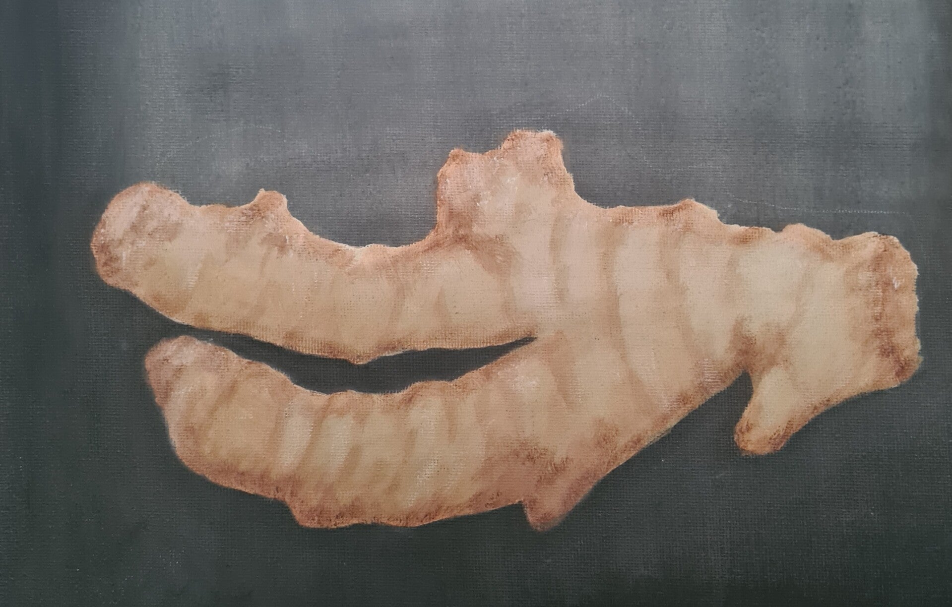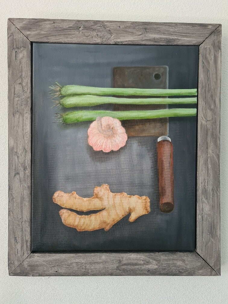 Hakmes met groenten, geschilderd op doek.