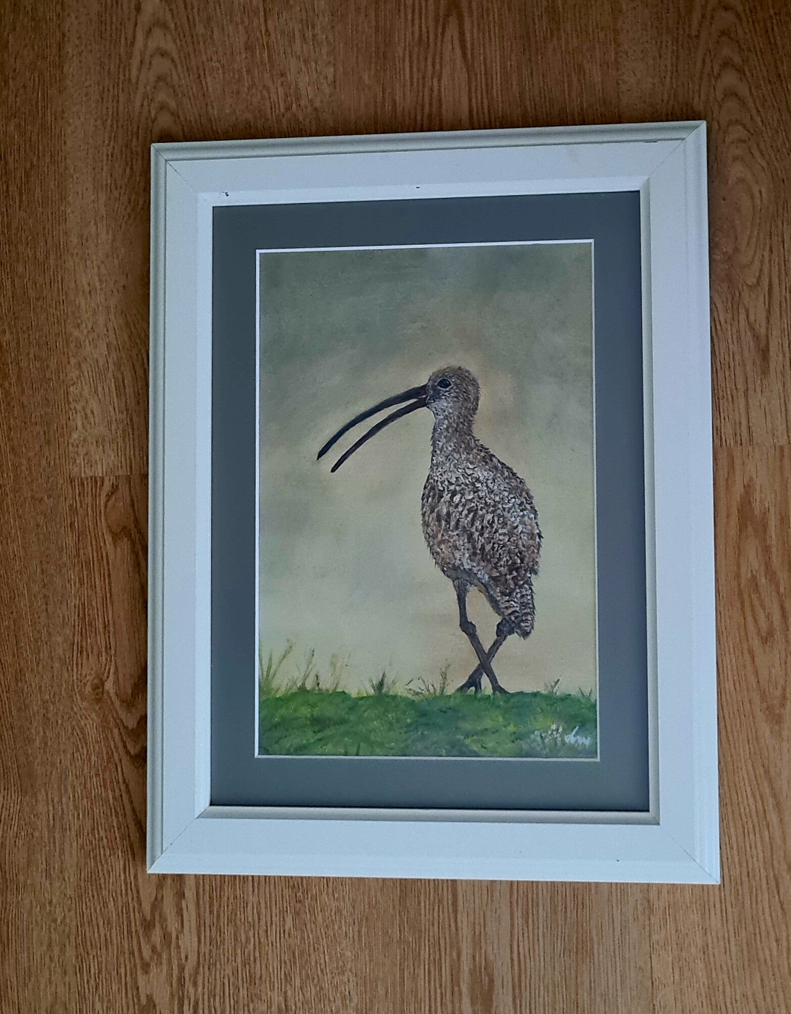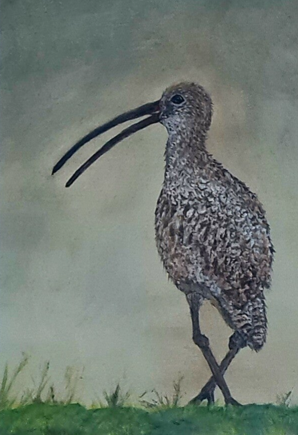 Steltloper op zoek naar eten, geschilderd op doek.