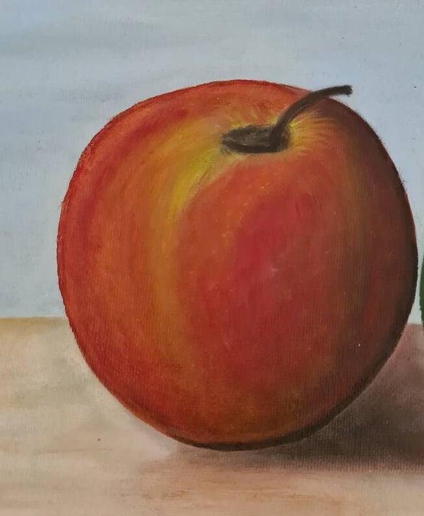 Twee appels, twee soorten naast elkaar, geschilderd op doek.